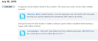 Interestingly some of the key players are actively tweeting, they need to, for it is a place to communicate, and if peeps (people on twitter) are listening, then, if you want your voice to be heard you need to talk here.  Anyway I have been active, and as you can see from the tweet comments above, that appeared on the ABC website, the political journalist Laurie Oakes has commented on one of my tweets.